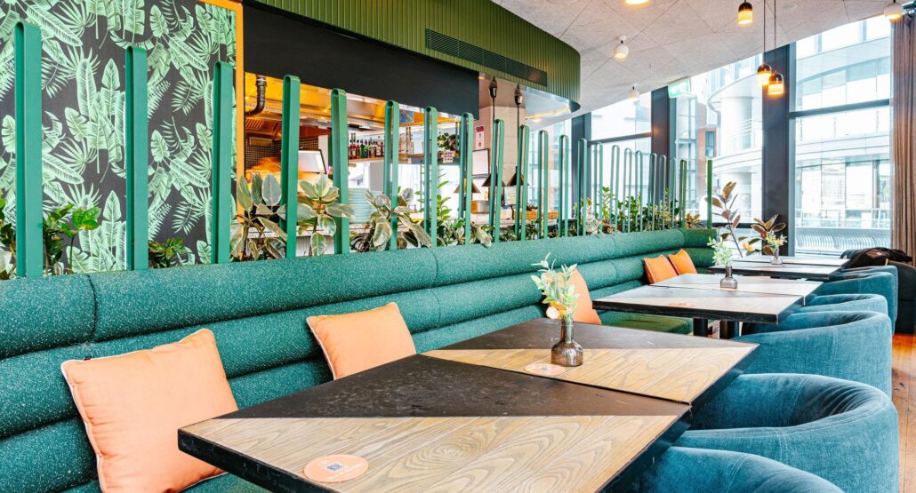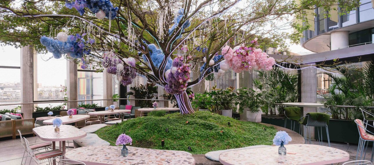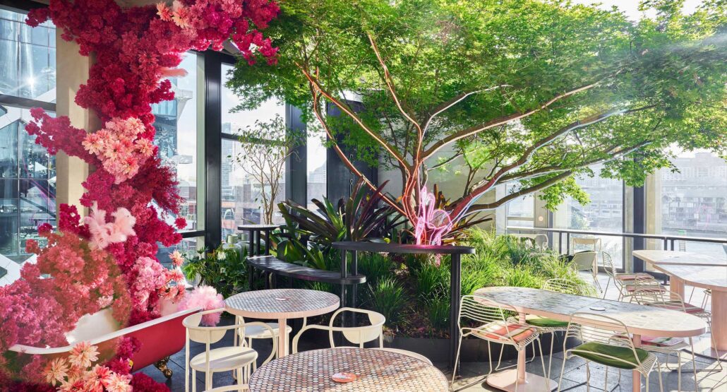 Featuring an external green stairwell, this vibrant space comes complete with a sleek marble bar, lush greenery, indoor and outdoor spaces filled with vivid, colourful furniture.